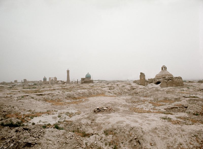 Stadsbebyggelse av orientalisk karaktär bl. a. Kalonmoskens minaret i Buchara Uzbekistan och en madrassa som är en skola för religiösa studier främst av islamisk karaktär.
