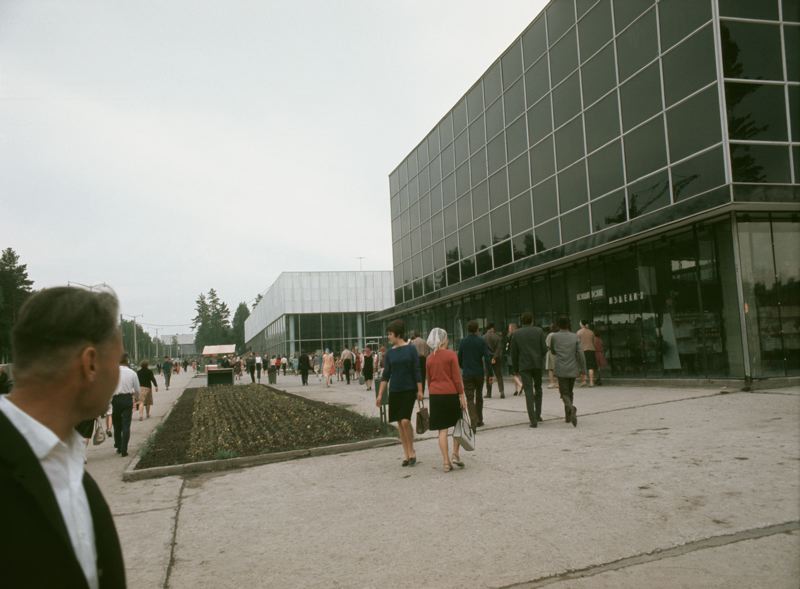 Byggnader med stora glasfönster och människor som passerar förbi.