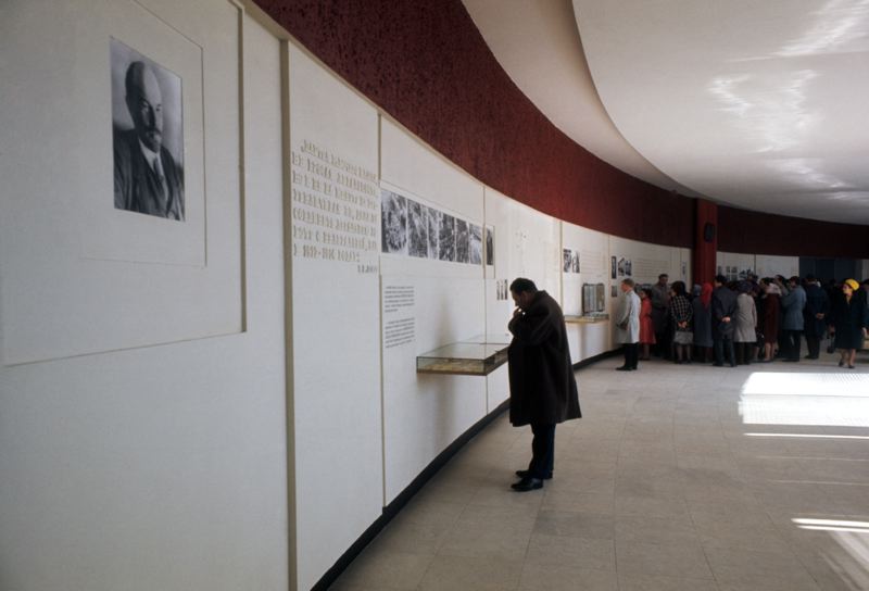Utställning med bild av Lenin eventuellt från Leninmausoleet.
