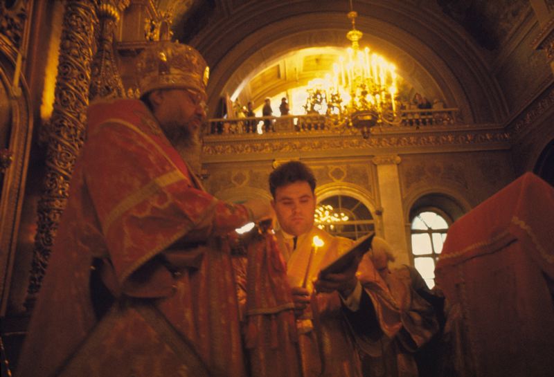 Interiör från rysk-ortodox kyrka med biskop och präster.