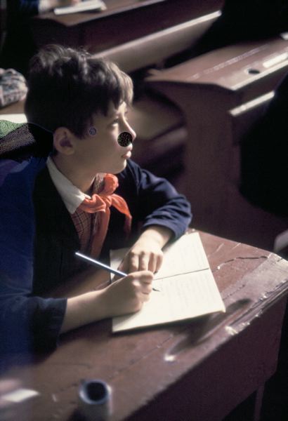 Pojke sitter vid skolbänk och skriver i en skrivbok.