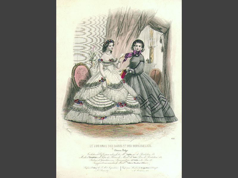 - Modeplansch med två avbildade kvinnor i salongsmiljö. Den ena klädd i en kång, vit klänning dekorerad ned röda och blåa blommor. Den andra kvinnan bär en lång, grå klänning med dekorationer i lila.