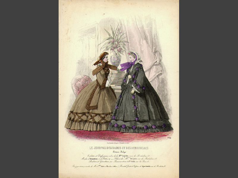 - Modeplansch med två kvinnor avbildade i salongsmiljö. Den ena kvinnan är klädd i svart klänning och kappa, båda dekorerade med lila. Den andra kvinnan är klädd i brun klänning med dekorationer mörkare brunt.