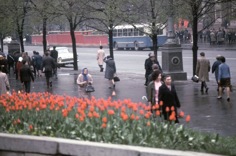 Stadsgata med fordonstrafik, trottoar med fotgängare i förgrunden en blomrabatt med röda tulpaner.