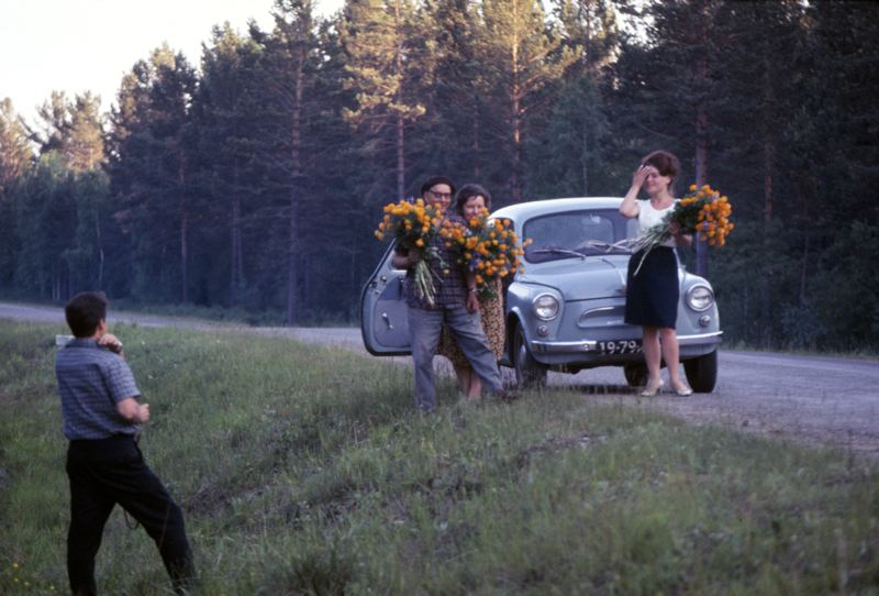En man och två kvinnor med blomsterbuketter stående utanför en bil parkerad vid vägkantan, ytterligare en man står till vänster en bit framför bilen.