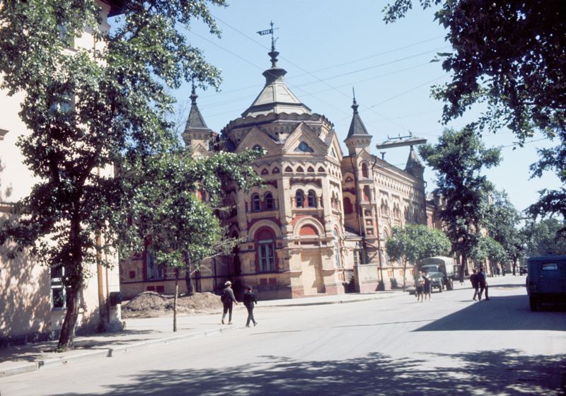 Stadsbebyggelse, gatukorsning med fotgängare och fordonstrafik, vackert utsirad byggnad belägen i korsningen.