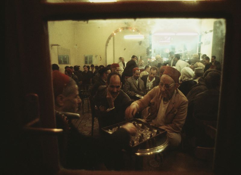 Interiör från ett café, män sitter vid bord och spelar någon sorts brädspel.