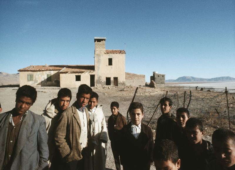 Kargt landskap med två byggnader och taggtrådsstängsel. I förgrunden en grupp pojkar.