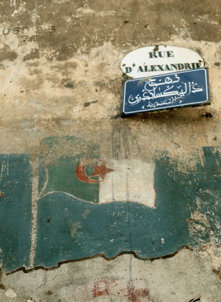 Gatuskyltar i både latinska och arabiska alfabetet på skylt i Algiers kasbah.