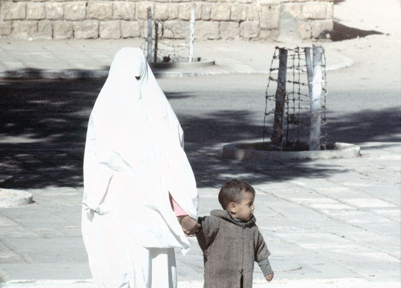 Stadsgata, kvinna klädd i burka håller liten pojke i handen.