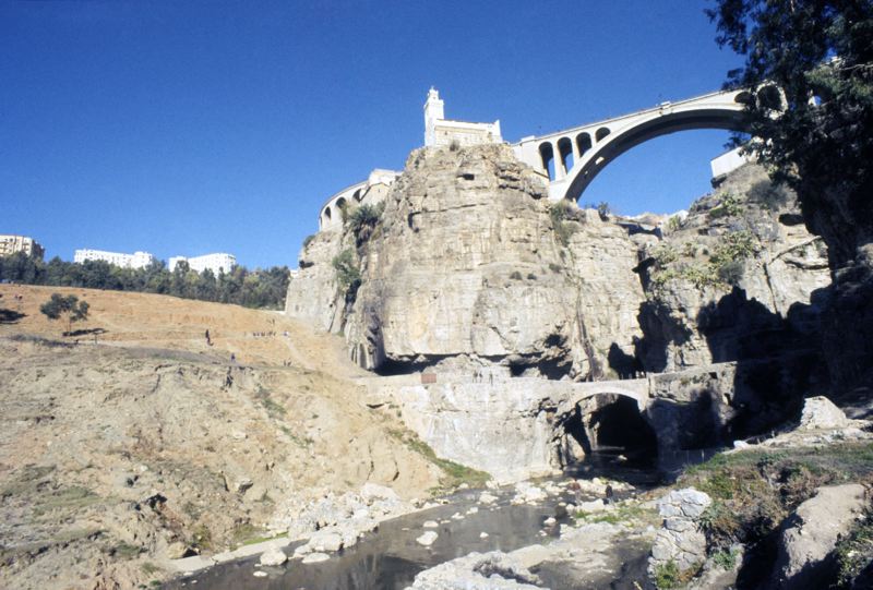 Byggnader i utkanten av Constantine, två broar leder över ett vattendrag, den övre bron har inbyggda valvbågar och strax innan bron ligger en kyrka.