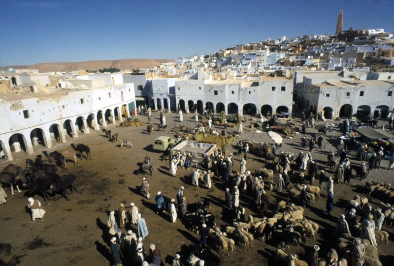 Djurmarknad med torghandel i bakgrunden är staden Ghardaia.