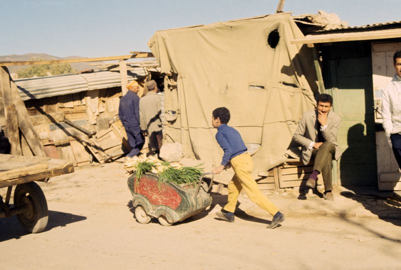Slumbebyggelse. Skjul med tak av korrugerad plåt delvis täckt av en presenning. En pojke passerar med en gammal barnvagn full av grönsaker. Fyra män är utanför skjulet.
