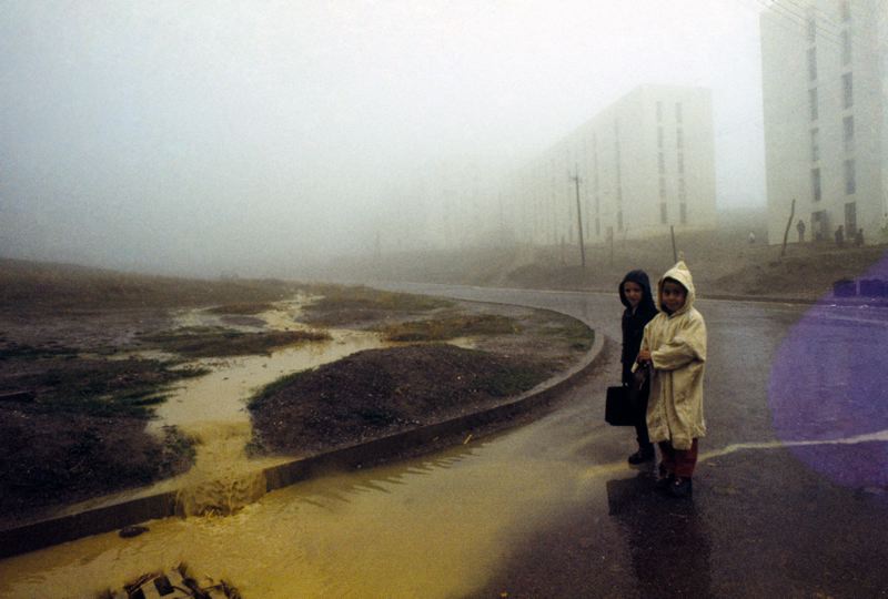 Två barn klädda i regnkläder står på en gata i ett bostadsområde i Tizi Ouzou i bergsområdet Kabylien.