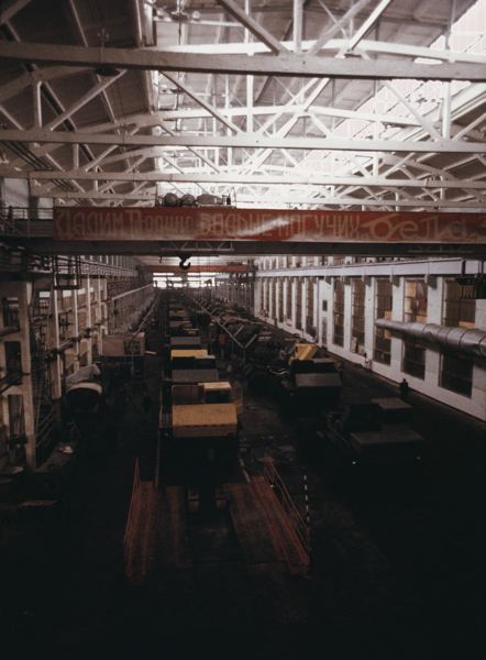 Fordonstillverkning. Industrilokal med fordonskarosser på löpande band. Fordonsdelar staplade vid sidan.