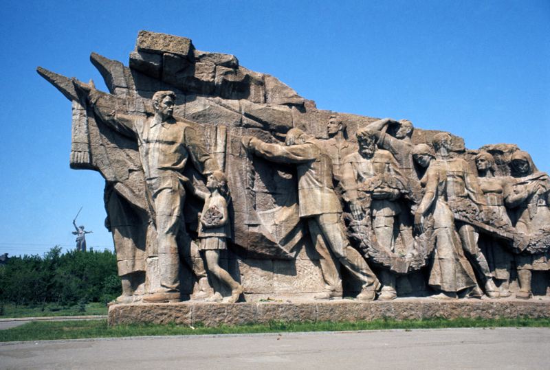 - Krigsmonument i Stalingrad f.d. Volgograd, minnesmärke över slaget vid Stalingrad, i bakgrunden på bilden beläget på en höjd kallad Mamayev Kurgan syns kvinnostatyn kallad Rodina Mat Sovyot och som är 84 m hög.