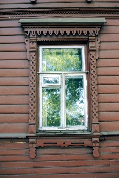 Byggnadsdetalj, utsirat fönsterfoder och överstycke.