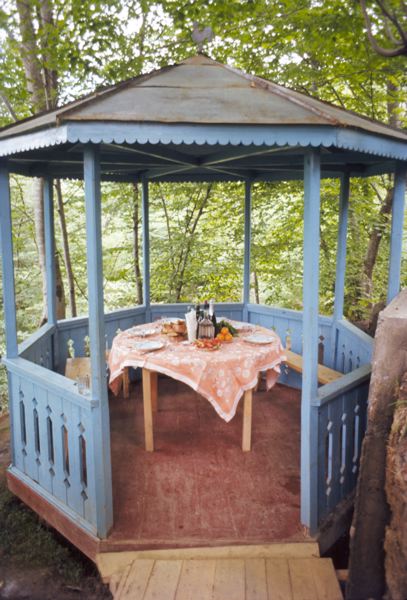 Paviljong med uppdukad måltid.