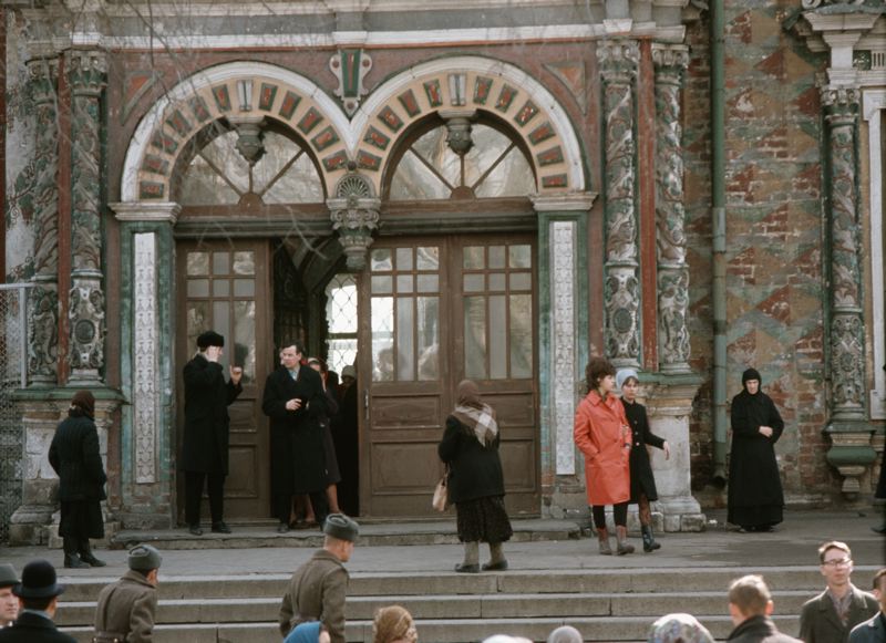 Människor på väg ut och in genom dörröppning. Några står utanför andra är på väg uppför trappan.