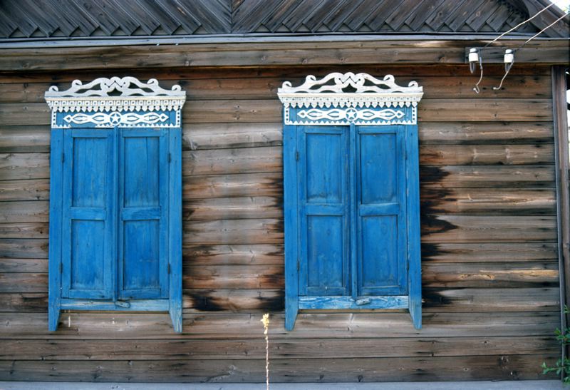 Lövsågade träöverstycken till fönster med blå fönsterluckor.