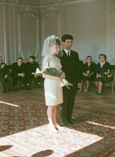 Bröllop, brudpar med bröllopsgäster sittande längs väggarna.