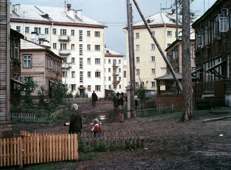 Bostadsområde med blandad bebyggelse nya betonghus och äldre trähus, lerig gångväg mellan husen.