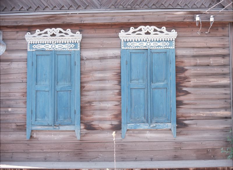 Lövsågade träöverstycken till fönster med blå fönsterluckor.