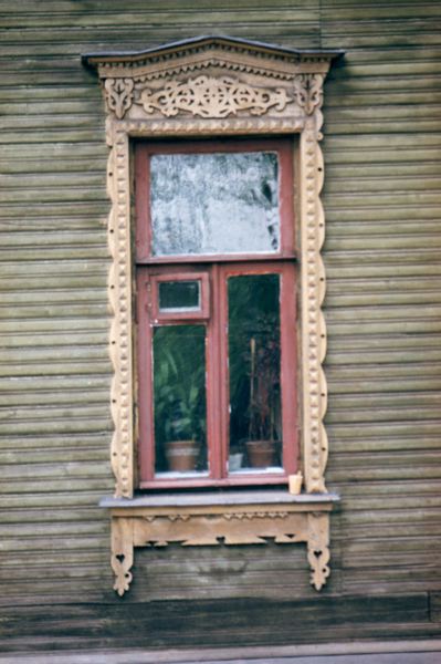 Byggnadsdetalj, utsirat fönsterfoder och överstycke.