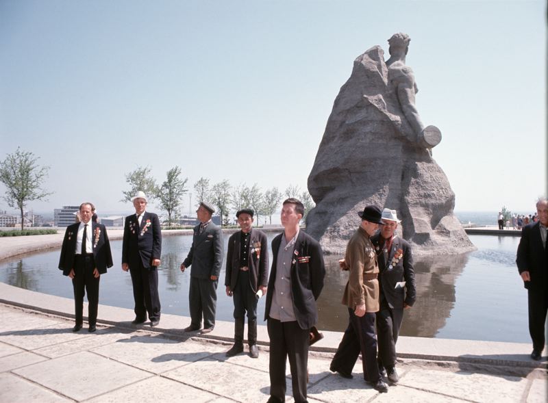 Krigsmonument i Volgograd f.d. Stalingrad, minnesmärke över slaget vid Stalingrad, en grupp krigsveteraner står framför en damm med en staty i mitten.
