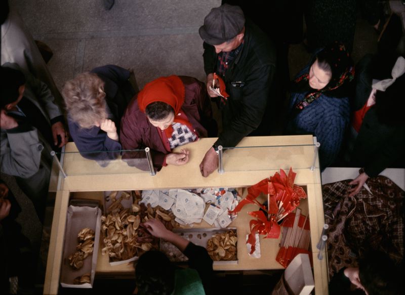 Kvinnlig försäljare säljer miniatyrflaggor och ballonger till köande kvinnor och män.