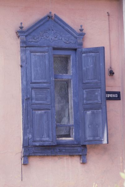 Blåmålade fönsterluckor och överstycke med reliefdekor.