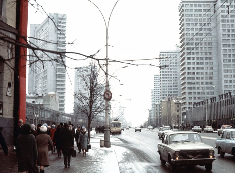 Stadsbebyggelse, gata med fotgängare, bil- och spårvagnstrafik. Byggnaderna som kantar gatan är både höghus och lägre byggnader.