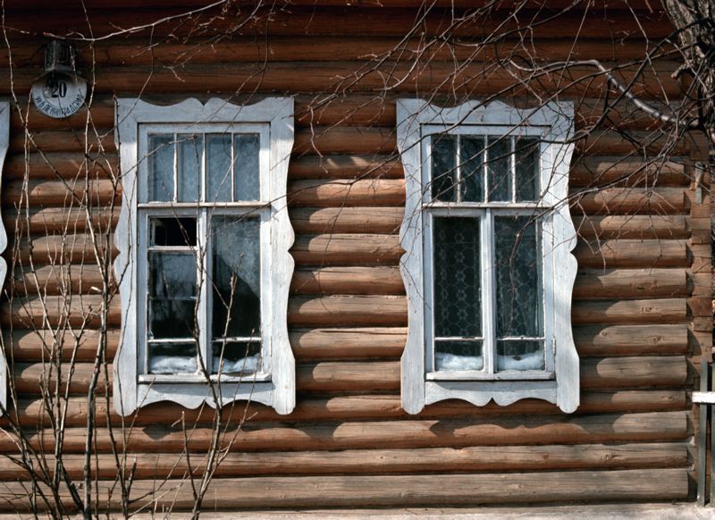 Träbyggnad med vita utskurna fönsterkarmar.