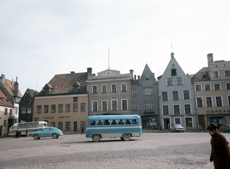 Stadsbebyggelse. Torg kantat av hus med affärsverksamhet i bottenplanet. Enstaka fordon på torget bland annat en gammal buss.