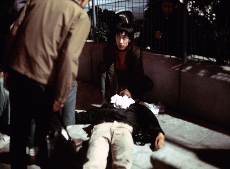 Skadad blodig man ligger på trottoaren, en man håller upp hans huvud. Har eventuell skada i bröstet som är täckt med vita servetter.