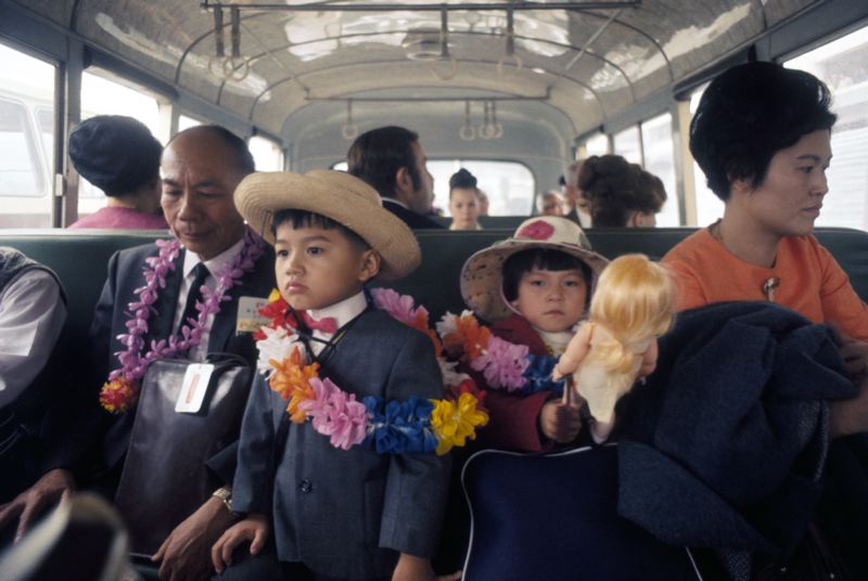 Passagerare på en buss. Familj med blomsterkransar runt halsen.