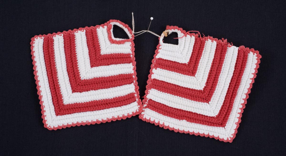 Två stycken grytlappar virkade i rött och vitt bomullsgarna. Kilformat mönster. Kvadratiska.