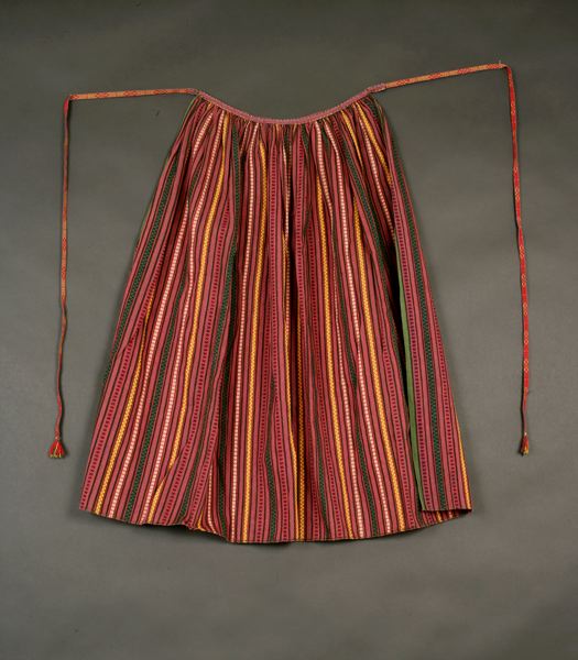 - Allmogeförkläde i rosengång av bomull och ylle. Mörkrött med täta ränder i rosengång och tuskaft i svart, gult, vitt, grönt och blått. Smal handsydd fåll nertill och längs sidorna. Upptill rynkad mot en smal linning av ett tyg liknande förklädets. Påsydda, smala knytband, möjligen maskinvävda, mönstrade i rött, gult och grönt och avslutas med en tofs.