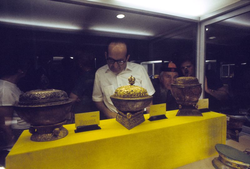 Museibesökare tittar på brons-eller mässingskärl utställda i en monter.