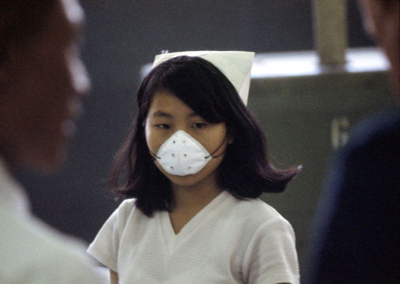 Kvinna med uniformsmössa och munskydd, förmodligen sjukvårdspersonal.
