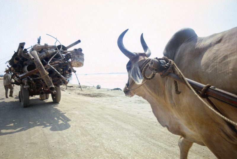 Djur drar vagnar som är tungt lastade med metallskrot.