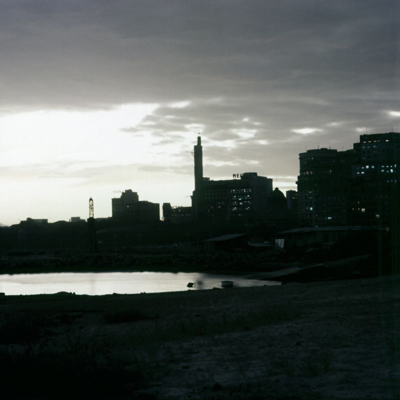 Stadsbebyggelse, bild tagen i skymningen från stranden upp mot staden.