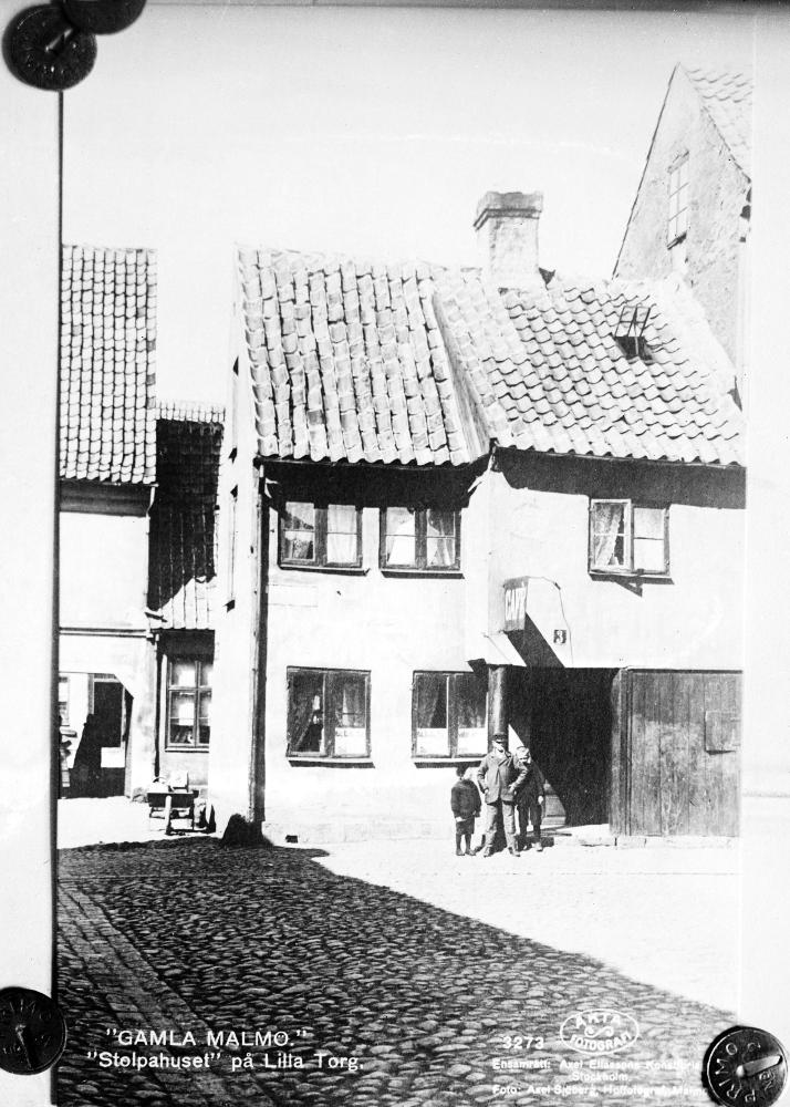 "Stolpahuset" på Lilla Torg. Repro av vykort ur serien "Gamla Malmö".