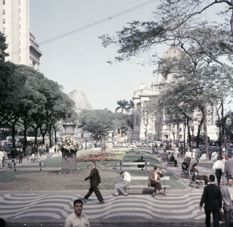 - Stadsbebyggelse, trädkantade gator med lokal stadstrafik, mellan gatorna finns en plantering med blomrabatter, statyer och bänkar längs med trottoaren, människor sitter på bänkarna eller går förbi på trottoaren.