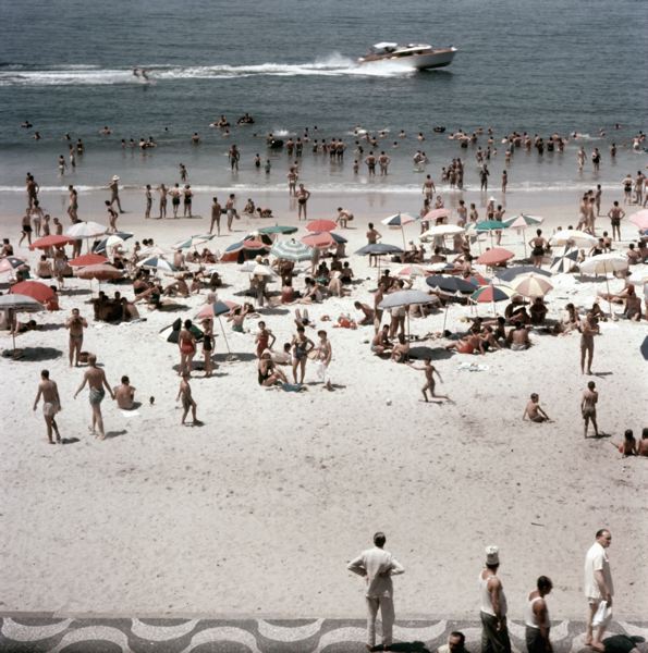 Strand med solande och badande människor, en motorbåt kör förbi stranden.