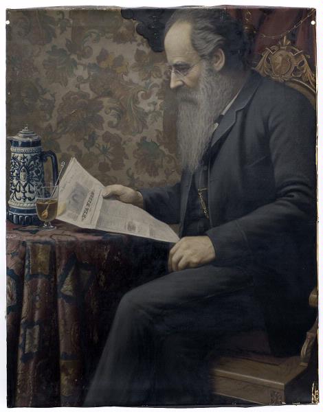 Porträtt i profil. Sittande man med långt grått skägg och glasögon, läsande tidskriften "Nya Nisse". Benen är korslagda med vänster ben över det högra. Till vänster ett bord, ett ölkrus, ett glas med en sked i. I bakgrunden blommig tapet med rocaille blad.