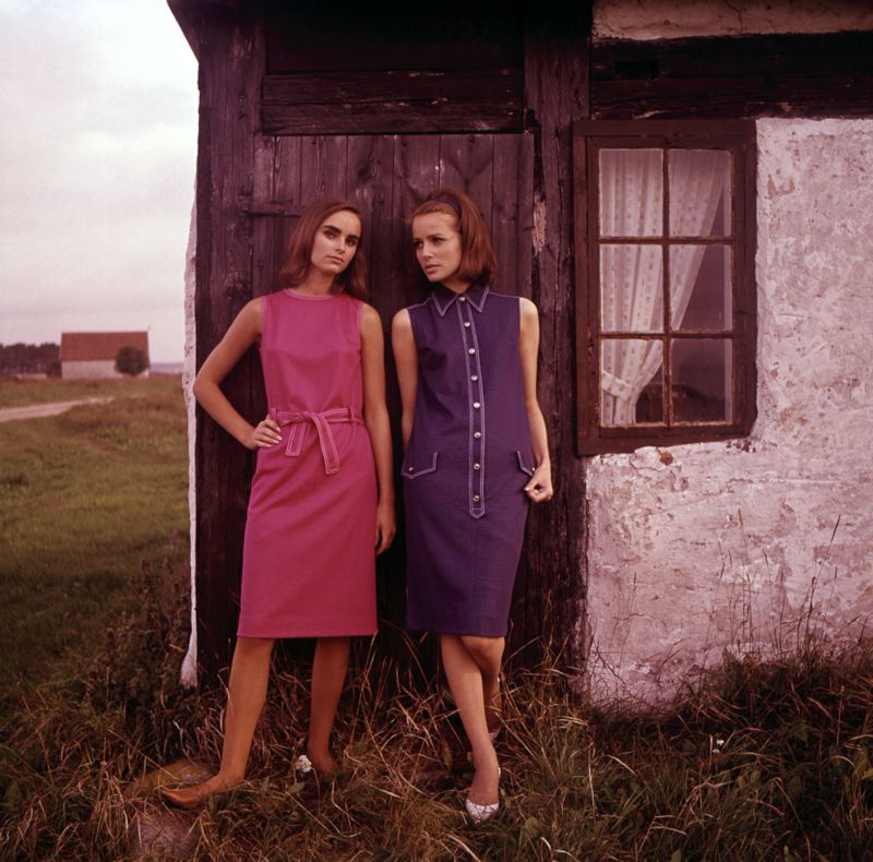 Modefoto, kvinnor klädda i ärmlösa klänningar, den ena med sakärp den andra med krage, fickor och knäppning på framsidan ner till övre delen av låren.