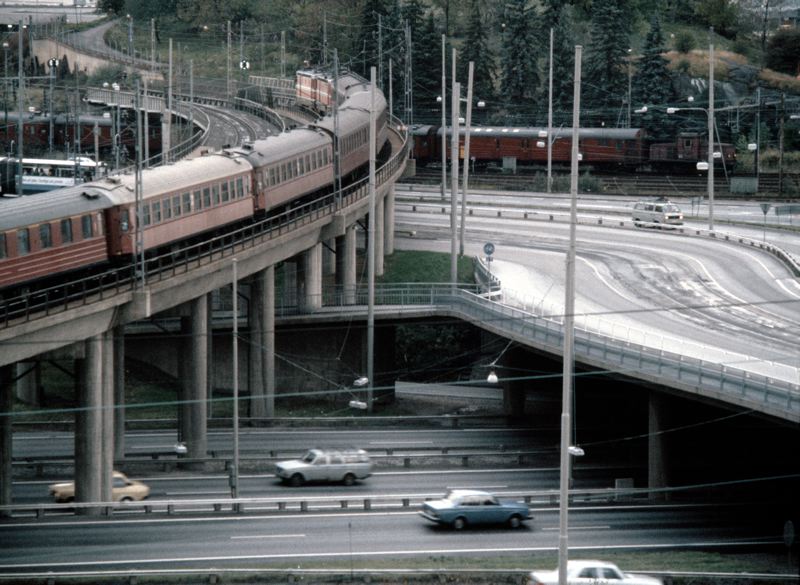Stadsbebyggelse, motorväg med vägbro och järnvägsbro. Ett passerande tåg på bron. Under järnvägsbron går ett spår i markplan, också där passerar ett tåg.