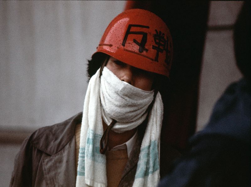 Man i röd hjälm med handduk som täcker nedre delen av ansiktet fastsatt under remmen som håller fast hjälmen.