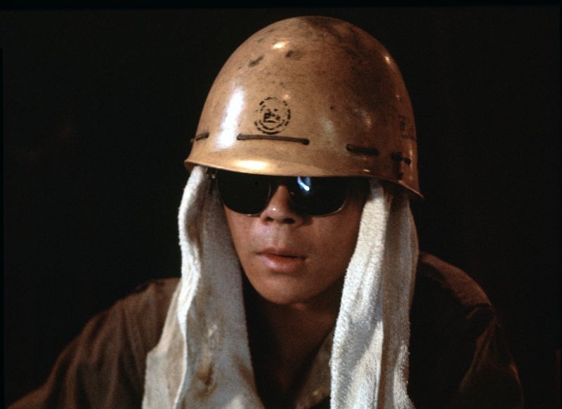 Ung man med solglasögon och en handduk hängande ut från under hjälmen.